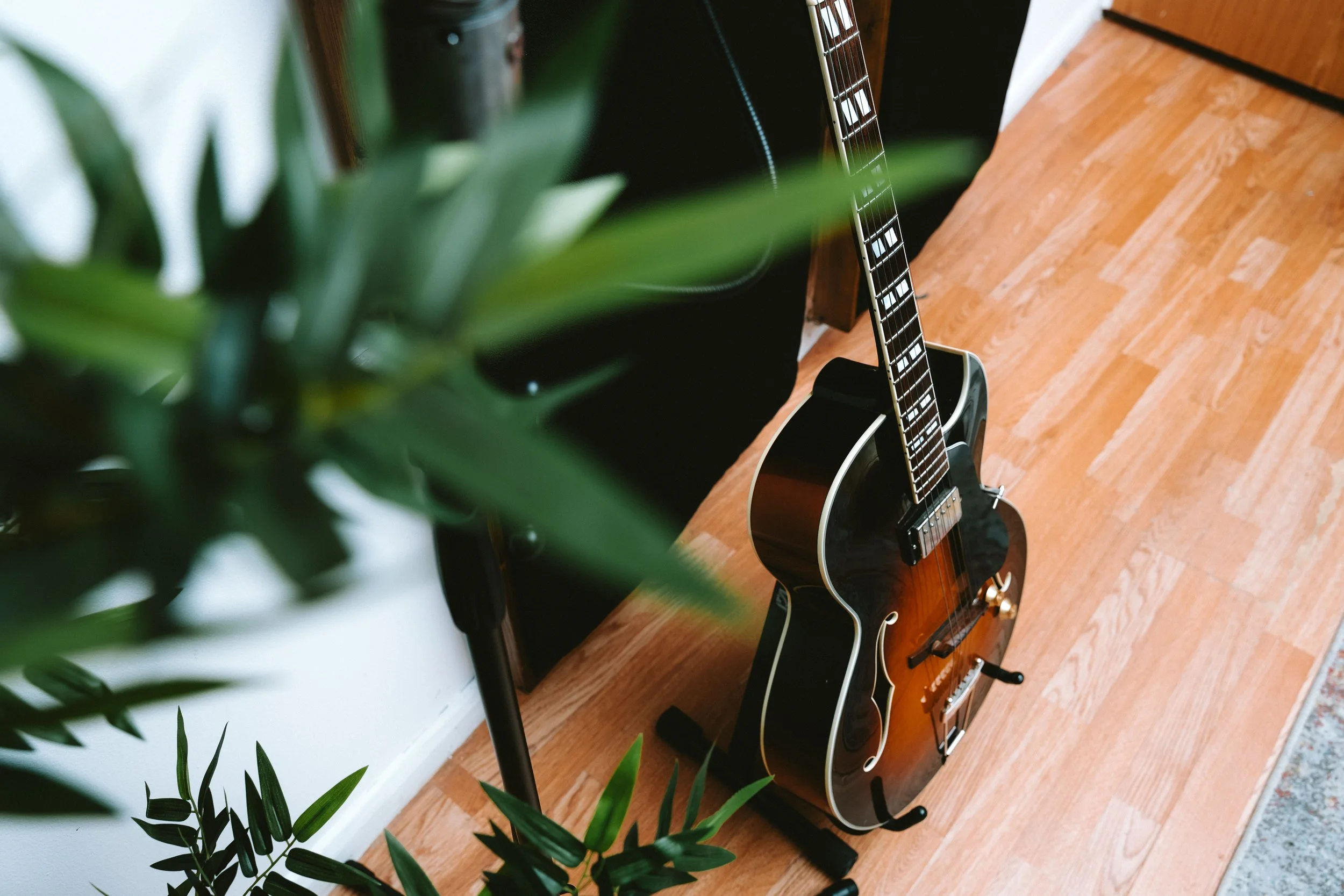An acoustic guitar with a sunburst finish, resting on a guitar stand on a wooden floor, partially obscured by green houseplants in the foreground.