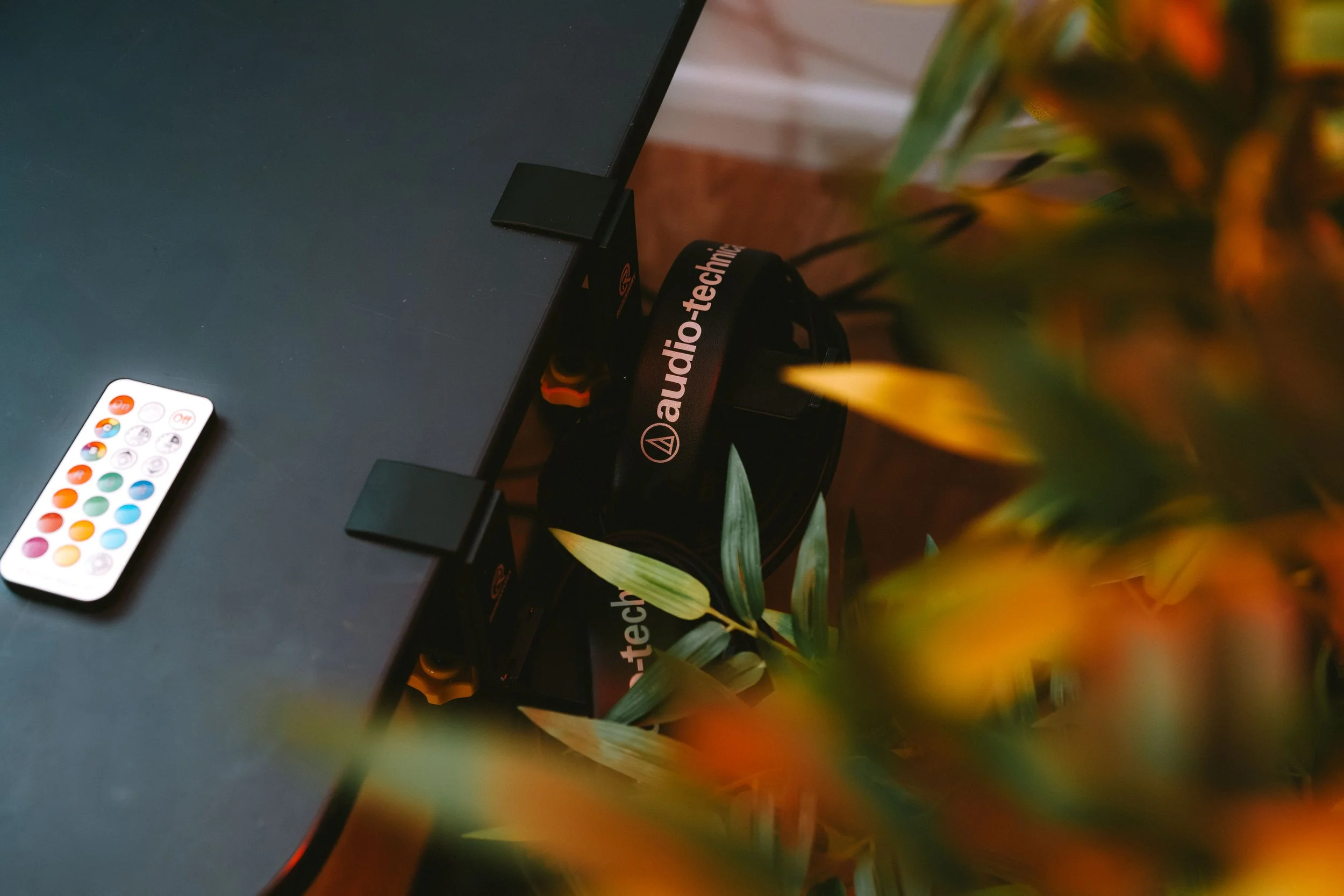 A black desk with a white remote control, a pair of Audio-Technica headphones on a stand, and a plant with green and yellow leaves partially obscuring the view.